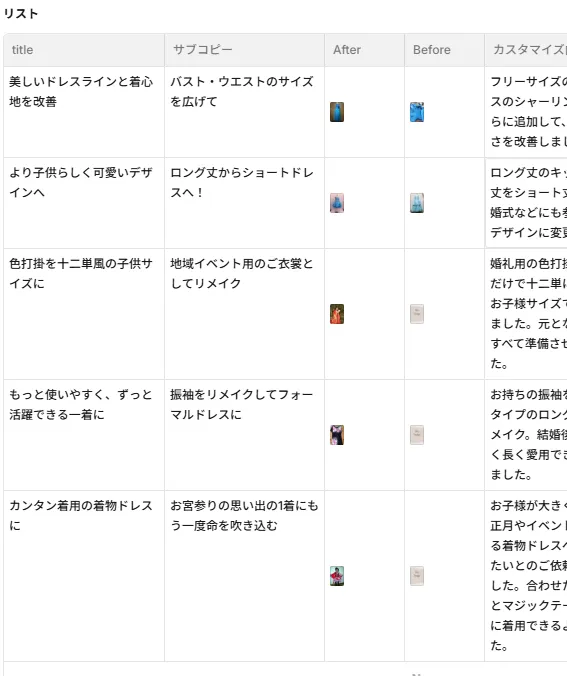 トップのスライドショーや、製作事例は、studioの便利なリスト機能で制作しています。エクセルのような表に写真や文字を選ぶだけで、決まったデザインに反映されるとっても便利な機能です。